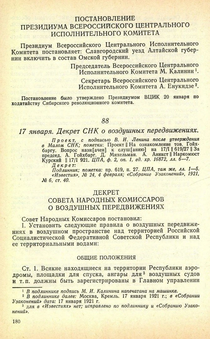 17 января 1921 года В. И. Лениным был подписан первый советский законодательный акт по авиации - Декрет «О воздушных передвижениях в воздушном пространстве над территорией РСФСР и над её территориальными водами».